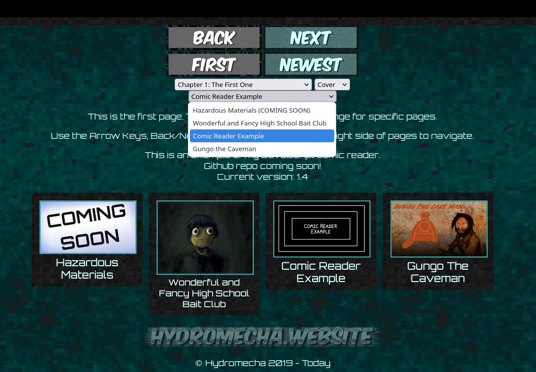The comic reader on Hydromecha.Website got a major overhaul recently. Instead of needing to go to a separate page to read each comic, everything now lives on a single .html file, using JavaScript to swap what comic is loaded. Individual comics can be linked to thanks to the hash system in the URL. I still need to get individual page URLs set up (so you can link to specific pages), among other things. I still have to go back through a bunch of stuff to swap out links to the old comic webpages.