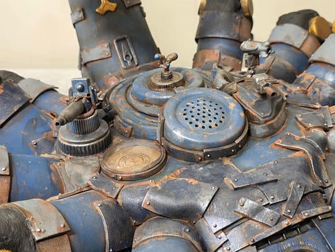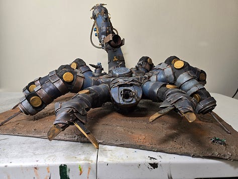 This thing is made of a smorgasboard of junk, model kit parts, and foam. The tail uses a phone receiver, the main body is an empty spool of printer filament, and the legs are largely made from deoderant stick parts. Every single rivet on the model is a tiny hemispheric bead. The entire underbelly of the model is covered in riveted panels that you can’t see because the thing’s so close to the ground. You’ll be able to see that and more in the making-of video that should be finished sometime before the end of the month.