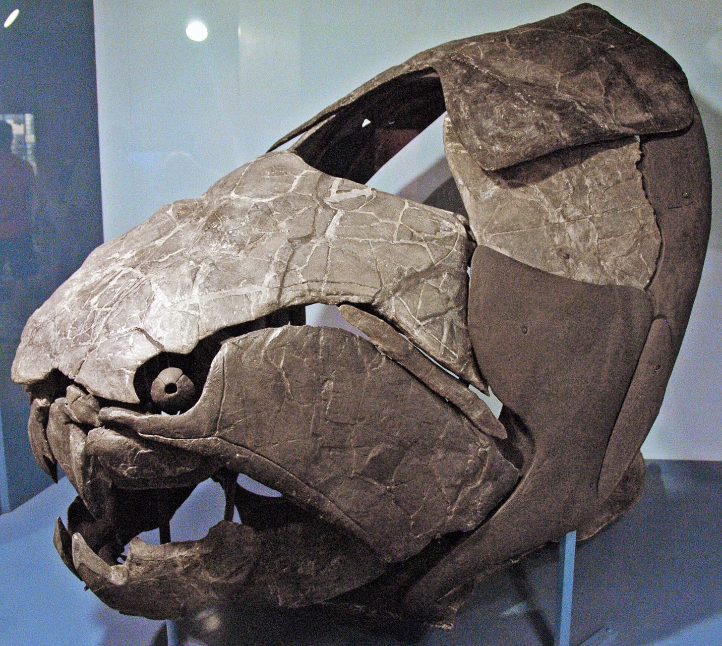 Dunkleosteus (pictured above) was an aquatic apex predator during the Late Devonian period. One of its most prominent features (and the only part we really have fossils of) was its heavily armored face, made of bony plates.