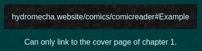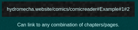 Previously, the hash in the comic reader's URL only included the name of the comic. This has now been expanded to include chapters and pages, giving you direct links to any specific chapter or page. The new hash format looks like this: #[Comic Name]#[Chapter Number]#[Page Number] where page 0 is the cover, usually. If you want to try it out, clicking on this link should take you to chapter 2, page 5 of Bugalo.