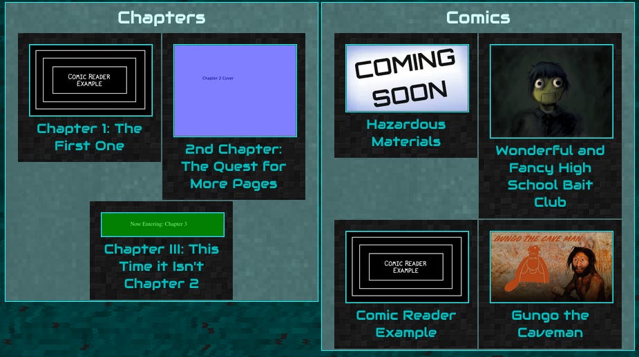 Buttons for different comics as well as the chapters of the current comic now fill in procedurally based on the comics' information. I had the comic buttons hardcoded into the page's html file in the previous version but now they all fill in automatically. I also set this up on the Comics page of the website.
