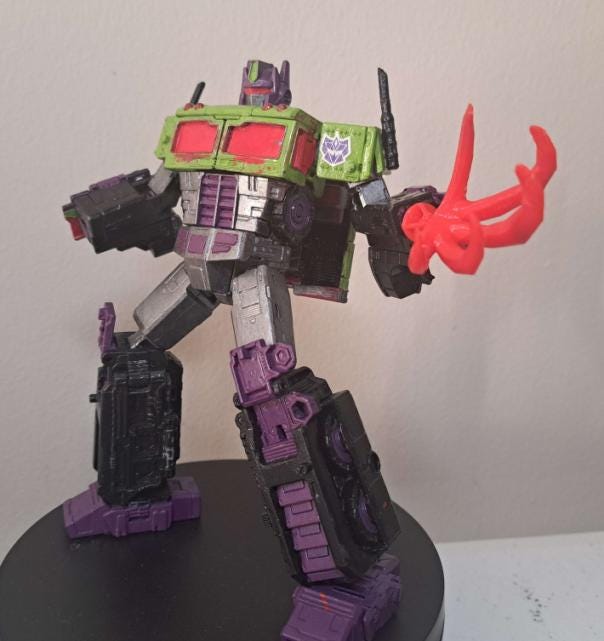 Back in the September '23 Recap I posted a WIP pic of this custom, explaining that I had messed up the stock figure's hands and needed to make replacements. I just recently finished up some models to do just that. Toxitron now has nozzles in place of his previous lack of hands along with some toxic sludge claws that can be plugged into them (the nozzle has a 3mm peg on the end so it's also blast effect compatible). The picture above shows some test prints using older versions of the models. Below are a few screencaps of the finalized models from Blender. I have those versions printed out, I just need to do some post-processing on them and paint them. I also want to make a fluid tank for Toxitron's vehicle mode that can turn into a turret or something in botmode.
