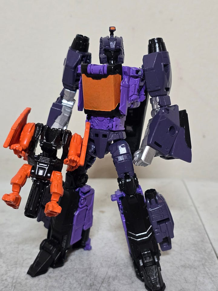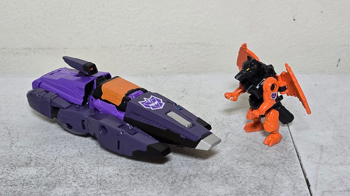 This is that Transformers custom I’ve been talking about for the past couple issues of the newsletter. It’s finally done! The purple one is Wiretap (repainted from Blurr), and his colors are based off of the Autoscout drone Soundwave used in a single episode of the G1 cartoon. Wingthing (repainted from Fangry) is the black/orange one, based on Soundwave’s Targetmaster (little robot that turns into a weapon) partner from his Action Master figure.