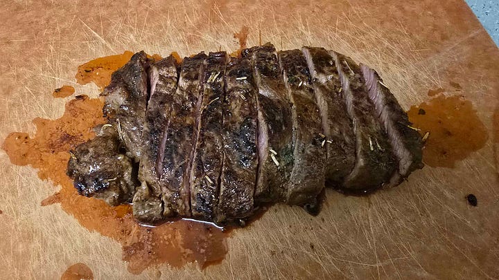 The steak in that last picture is a reverse-seared strip steak seasoned with salt, pepper, onion powder, garlic powder, a tiny bit of red pepper flakes, oregano, rosemary, cilantro, honey, a bit of lemon juice, and a whole bunch more lime juice.