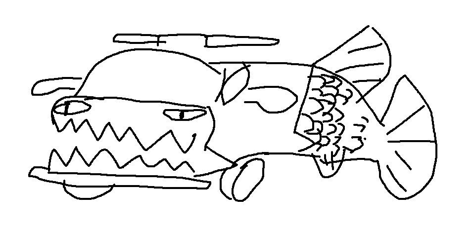 This is a stupid idea I had a while back that I finally scribbled down recently. It’s half ambulance and half fish. It tailgates boats with its high beams on. I’m gonna have to redesign this later so it fits the tech level of the setting better. It ought to have something more like a Model T for the front half.