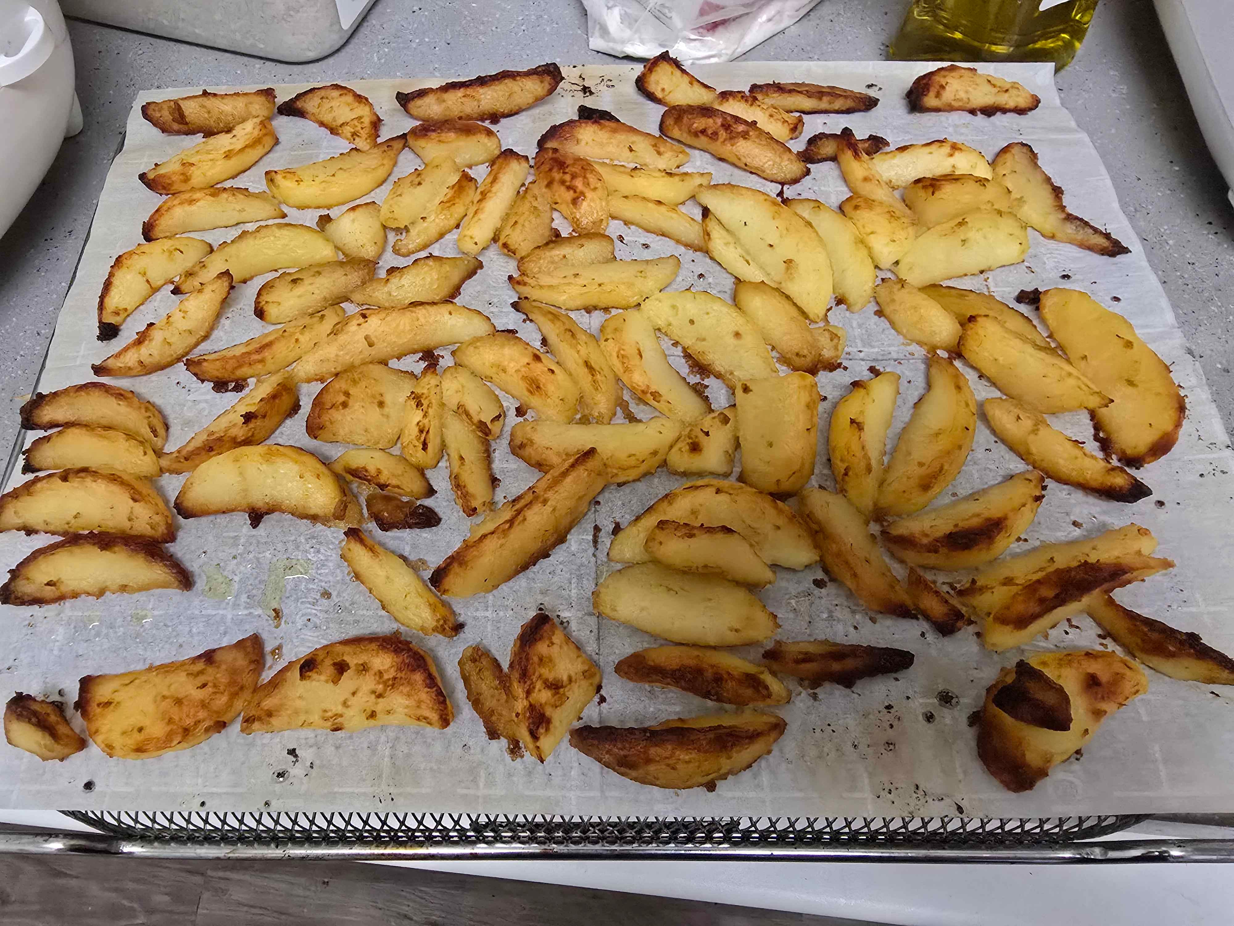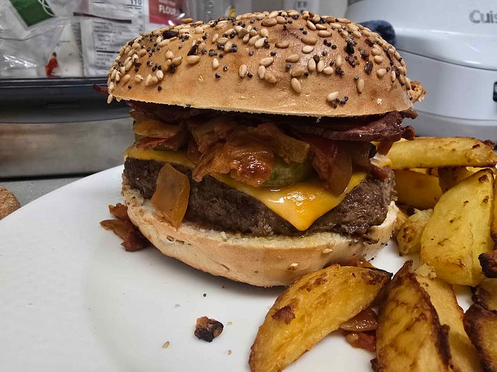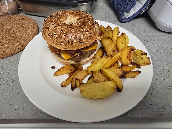 I also started making my own fries from scratch. These potatoes were soaked in water and baking soda overnight, boiled, and then covered with olive oil before being air fried. The fries in the second hamburger photo below were frozen before being air fried which made them even better.