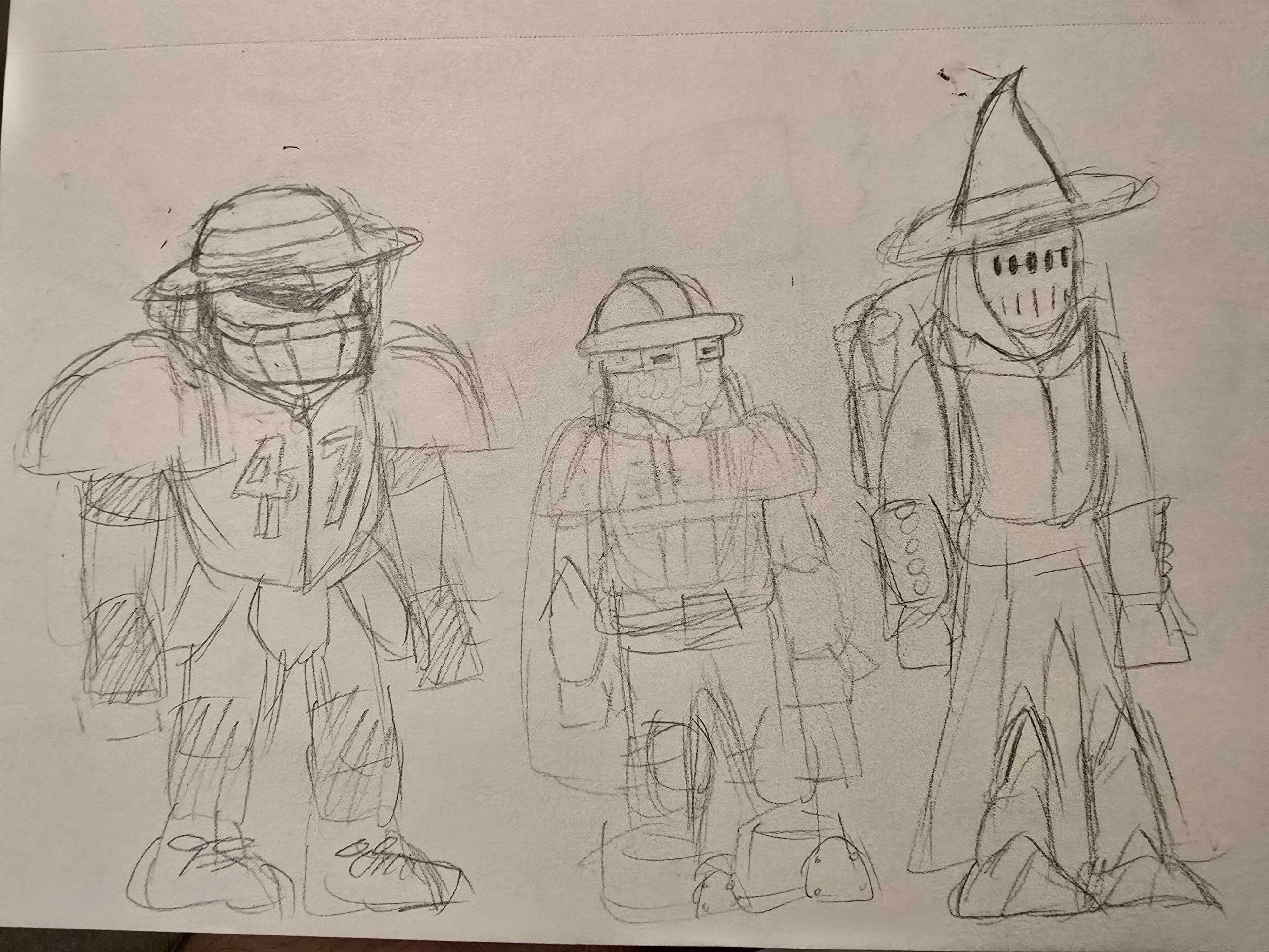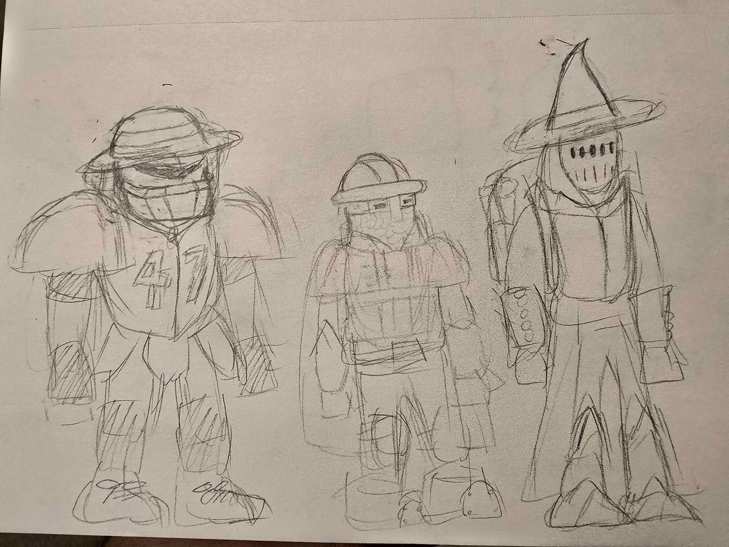 Here’s a super rough sketch of the characters from the short story I wrote a few months ago. From left to right we have Tackle Knight, Mine Knight, and Psych Knight. I might make these into 3D models later down the line.